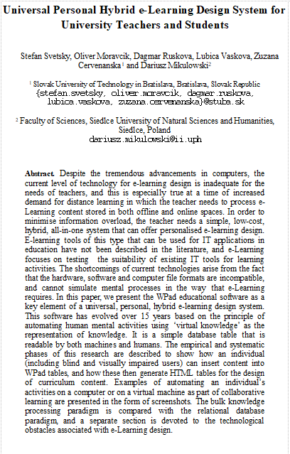 | [Go] | V4 EDUPORT Dr. Mikulowski: Prezentácia na MTF STU | DM | V4 EDUPORT pokračuje ako neprojektový výskum | 2024-07-03 | EN Internship presentation of Dr. Dariusz Mikulowski from University Siedlce at Faculty of Materials Science and Technology in Trnava | ![]() Within the internship a V4 EDUPORT meeting was running in cooperation with University Siedlce, University Ostrava, UIAM institute of Faculty of Materials Science and Technology in Trnava and Rektorat STU, including two online and physical workshops focused on training WPad BVI software for visually impaired. The internship was succesfully managed by the Departments of international projects of MTF STU and UIAM informatics institute by (Resetkova, Cervenanska). V rámci stáže prebiehalo stretnutie V4 EDUPORT v spolupráci s Univerzitou Siedlce, Ostravskou univerzitou, Ústavom UIAM Materiálovotechnologickej fakulty v Trnave a Rektorátom STU, vrátane dvoch online a fyzikálnych workshopov zameraných na školenie softvéru WPad BVI pre zrakovo postihnutých. Stáž úspešne viedli Katedry medzinárodných projektov MTF STU a Informatický ústav UIAM (Rešetková, Červeňanská). [Go] | Conferences V4 EDUPORT in China - ICIEIS 2024 | Journals | ICEIS 2024 | 2024-07-02 | We presented CSU model as Create-Select-Use infinite time loop model for knowledge processing | > ![]() ![]() ![]() The 6th International Conference on Informatics Engineering & Information Science (ICIEIS 2024) SHENZEN / Čína ==> prof. Oliver Moravčík prezentoval výstup projektu V4 EDUPORT "Design of a personalized IT system for teachers supporting adaptive, blended, and collaborative learning" (bude publikovaný v Springer book) [Go] | Publishing Springer 70 points in Punktoza | Journals | SK PIKS | 2024-06-17 | JP International Journal of Technology and Design Education [Go] | EDUPORT Open Source SPRINGER bez APC poplatku | Journals | SK PIKS | 2024-06-11 | JP Springer dohodol s CVTI, že môžeme za výhodných podmienok publikovať do týchto 2500 OPEN SOURCE časopisov | [Go] | PUBLISHING Selekcia časopisov SPRINGER pre EDUCATION | Journals | Výber z 2500 Open access časopisov Springer | 2024-06-10 | JP Výber EDU časopisov z Open Access A Springer | |